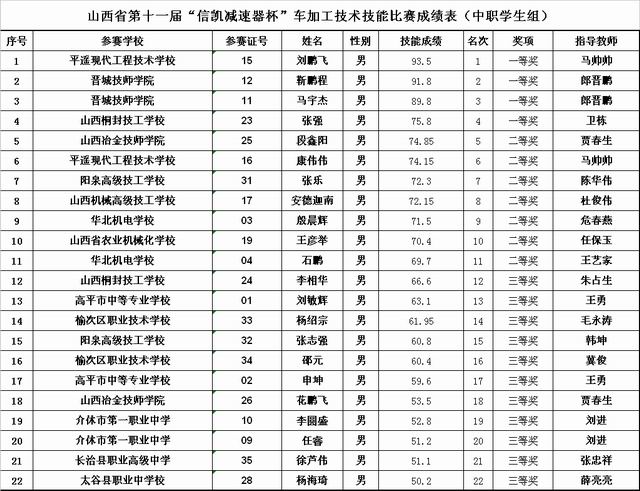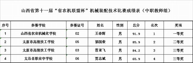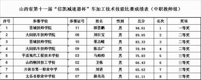 十一屆車加工技術、機械裝配技術技能大賽成績