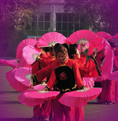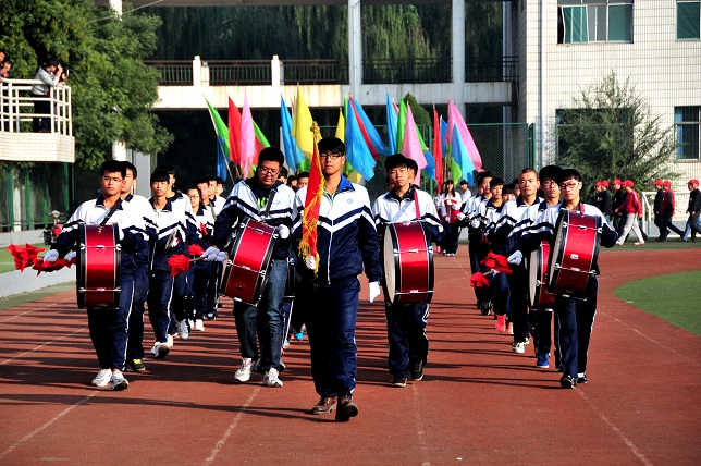 開幕式莊嚴(yán)而隆重。國旗班引導(dǎo)校旗、?;?、會徽、會旗入場,學(xué)生軍樂隊(duì)和彩旗隊(duì)引導(dǎo)裁判員方隊(duì)、教職工方隊(duì)、30個班級方隊(duì)依序正步通過主席臺,升國旗,奏國歌,裁判員和運(yùn)動員代表宣誓,每一項(xiàng)儀式都是一種愛國主義和集體主義的教育,激發(fā)在場所有師生胸懷中的正能量和神圣感。隨后進(jìn)行的大型團(tuán)體操表演,男生的軍體拳充滿了陽剛之氣,女生的扇子舞表現(xiàn)了整體之美。