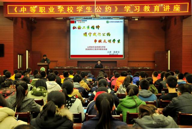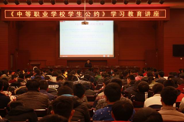 為響應(yīng)教育部發(fā)布《中等職業(yè)學(xué)校學(xué)生公約》,進(jìn)一步引導(dǎo)全體學(xué)生樹立正確的社會(huì)主義核心價(jià)值觀,我校開展了學(xué)習(xí)簽署踐行《中等職業(yè)學(xué)校學(xué)生公約》系列專題活動(dòng)。2016年11月22日和23日,高春寶校長(zhǎng)分兩批作了《中等職業(yè)學(xué)校學(xué)生公約》學(xué)習(xí)講座,為本次專題活動(dòng)拉開了序幕。