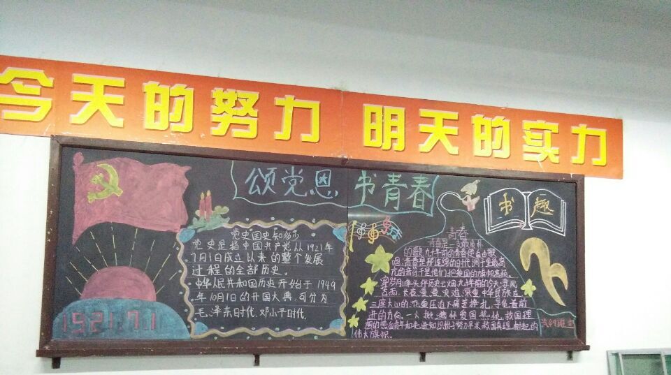 2016年6月,校團(tuán)委組織所有團(tuán)支部舉辦了紀(jì)念建黨95周年“頌黨恩,書青春”主題板報(bào)設(shè)計(jì)比賽。